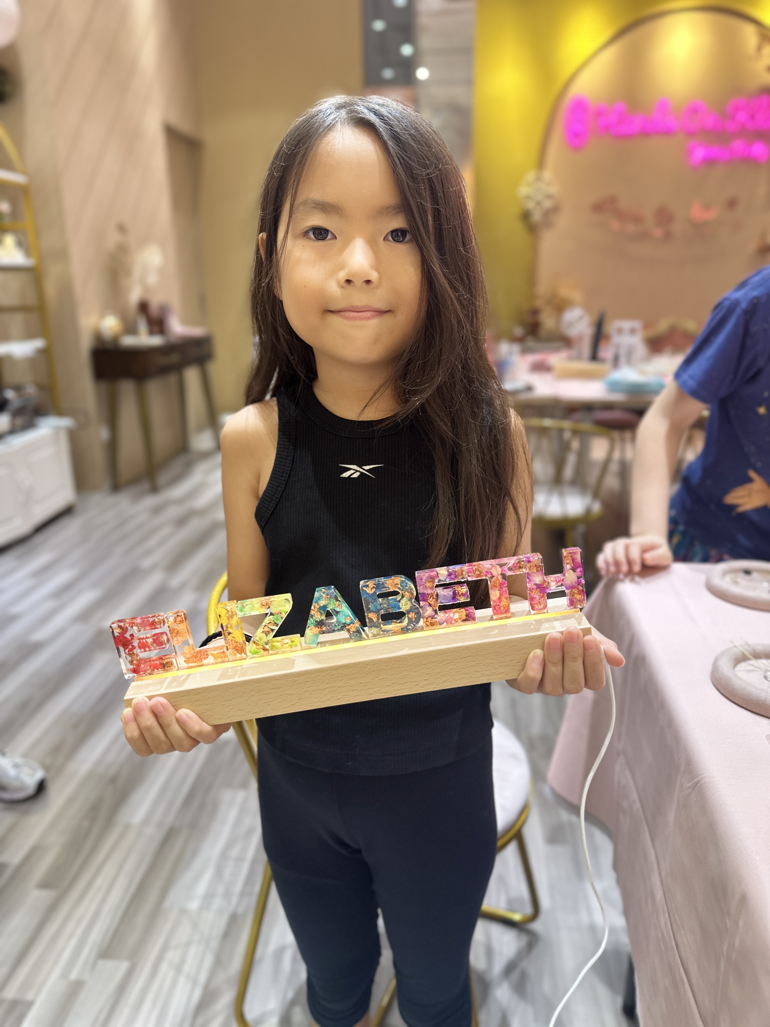 An enchanting workshop where creativity meets craftsmanship, allowing you to design a stunning illuminated name or word using preserved flowers encased in resin, a radiant piece of art that makes for a perfect bedside decor, a gift, or an aesthetic statement for your workspace.